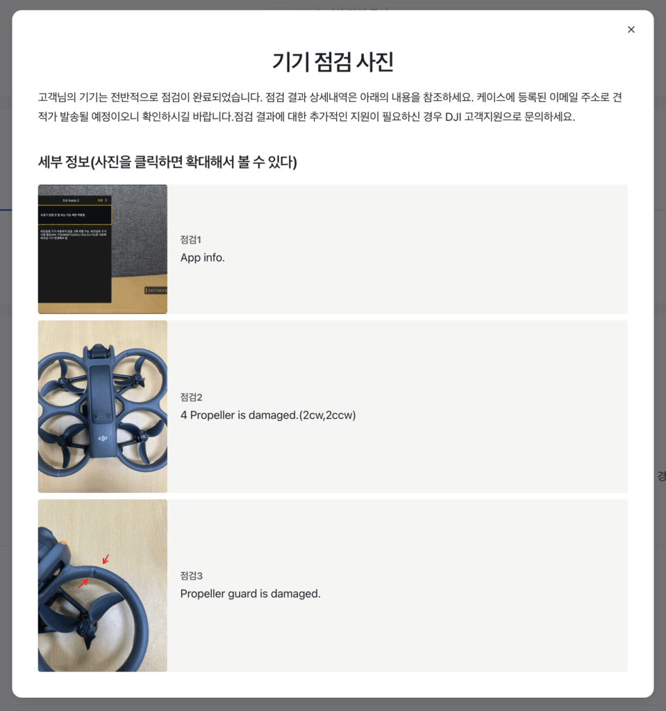 꽤나 자세하게 자체 진단결과, 파손부위 사진 등이 위의 스크린샷처럼 제공된다. 나의 경우 이번에 파손이 많지 않아서 이정도에서 끝났는데 물에 빠졌거나 하는 경우는 정말 자세한 사진들이 올라온다.